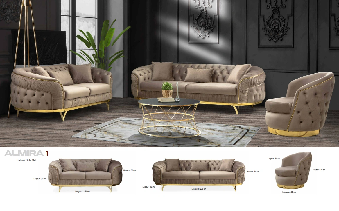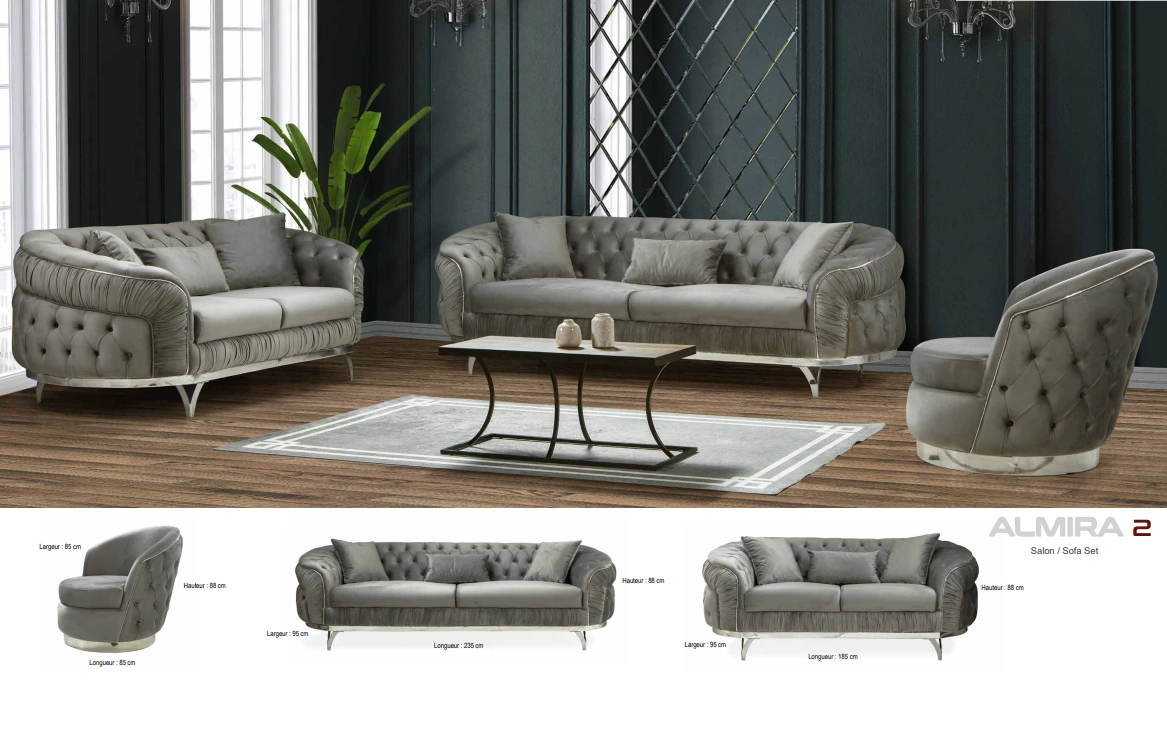 Découvrez le canapé ALMIRA 3+2+1 ou en angle – l’un des modèles les plus demandés à Paris. Fabriqué en Turquie avec tissu de qualité, pieds en métal, multi-couleurs et tailles personnalisables.