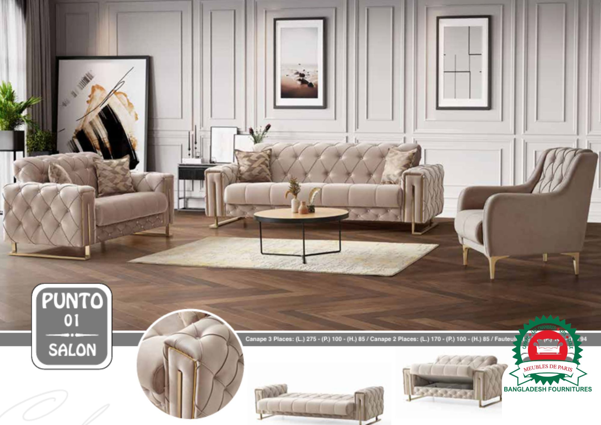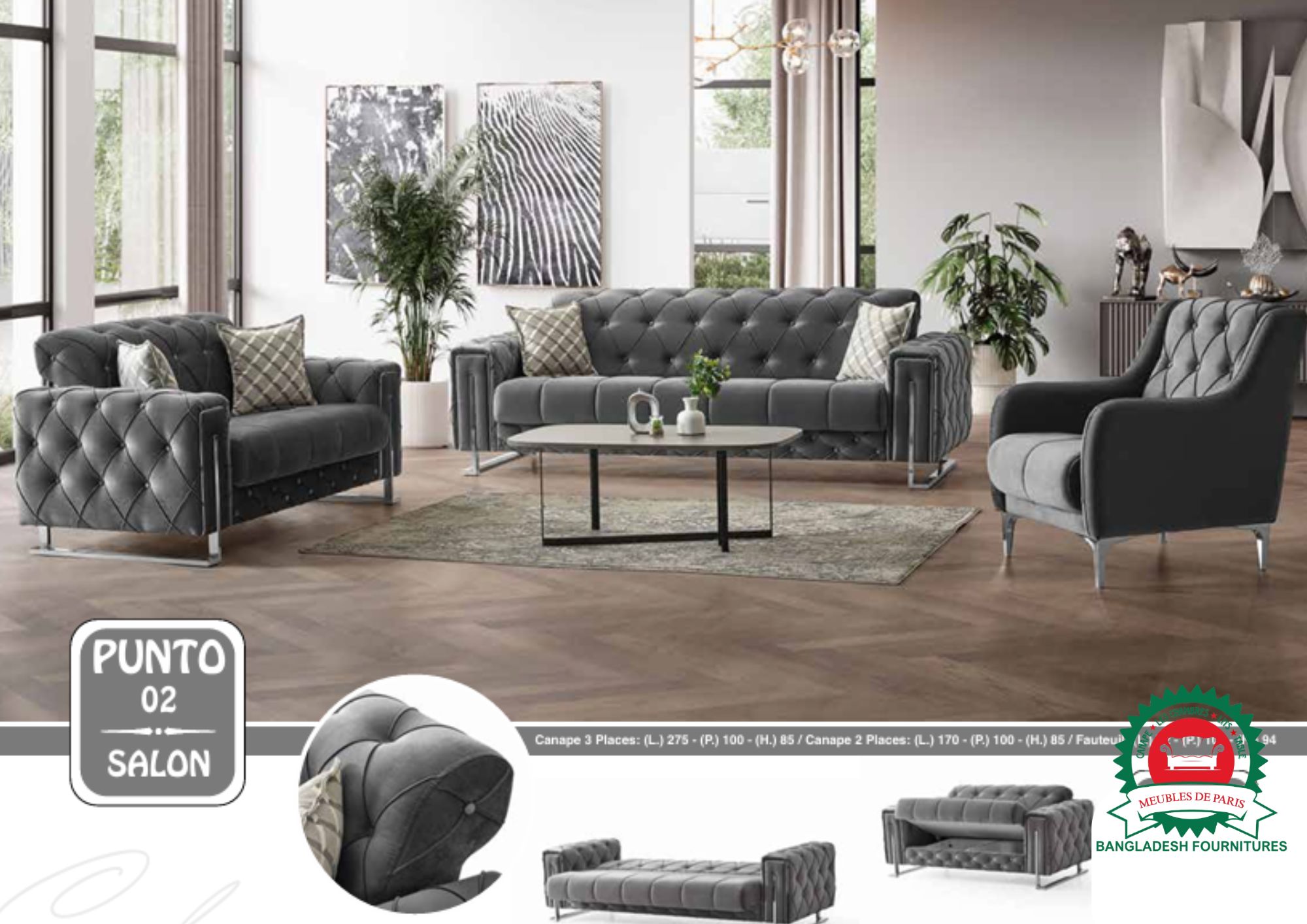 Découvrez le canapé PUNTO 3+2+1 ou en angle – l’un des modèles les plus demandés à Paris. Fabriqué en Turquie avec tissu de qualité, pieds en métal, multi-couleurs et tailles personnalisables.