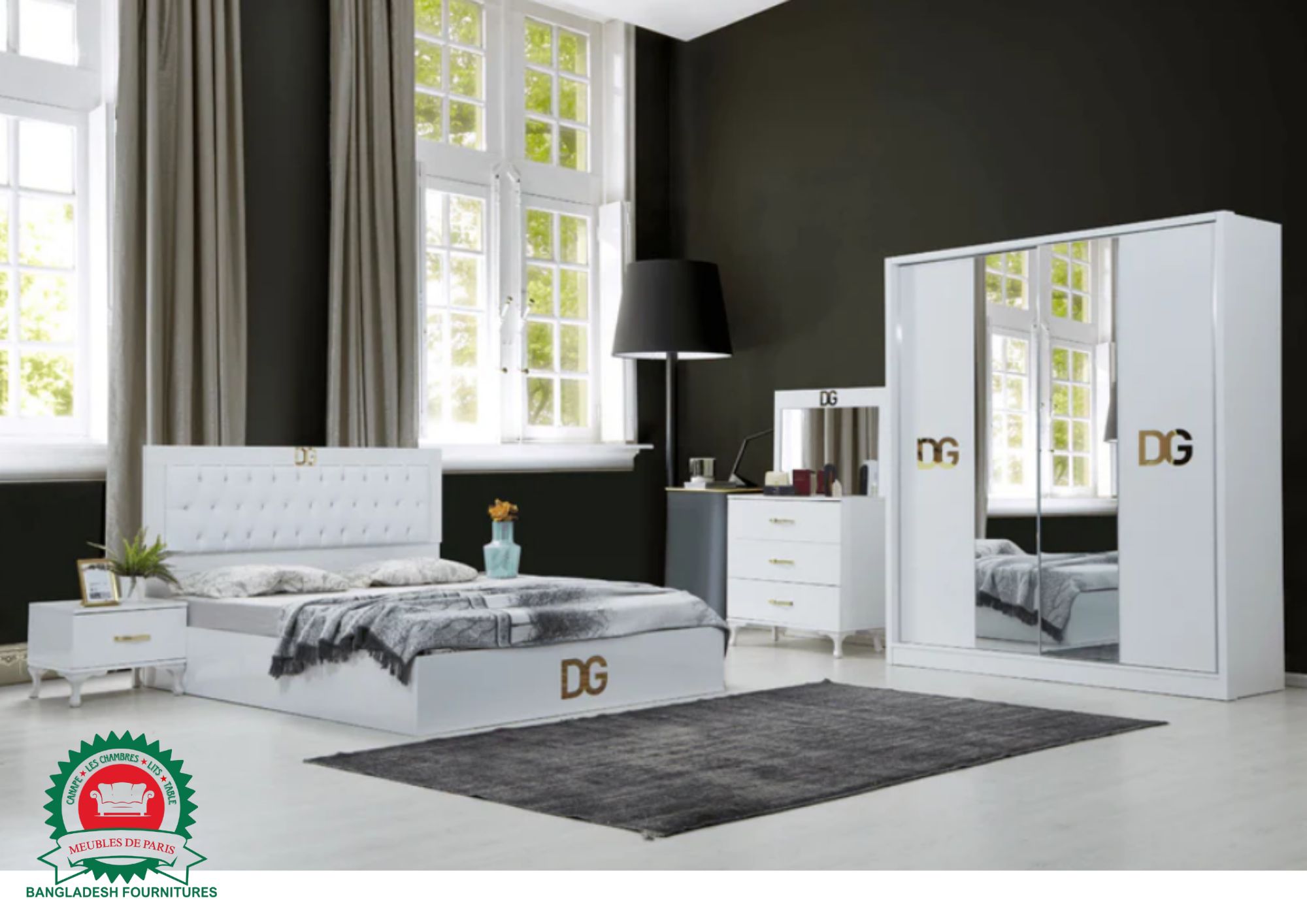 Transformez votre chambre avec cette chambre à coucher complète DG  6 pièces, alliant design moderne, qualité turque et prix imbattable. Disponible dans notre showroom Meubles De Paris à La Courneuve, ce pack est idéal pour un aménagement complet, élégant et fonctionnel de votre espace nuit.