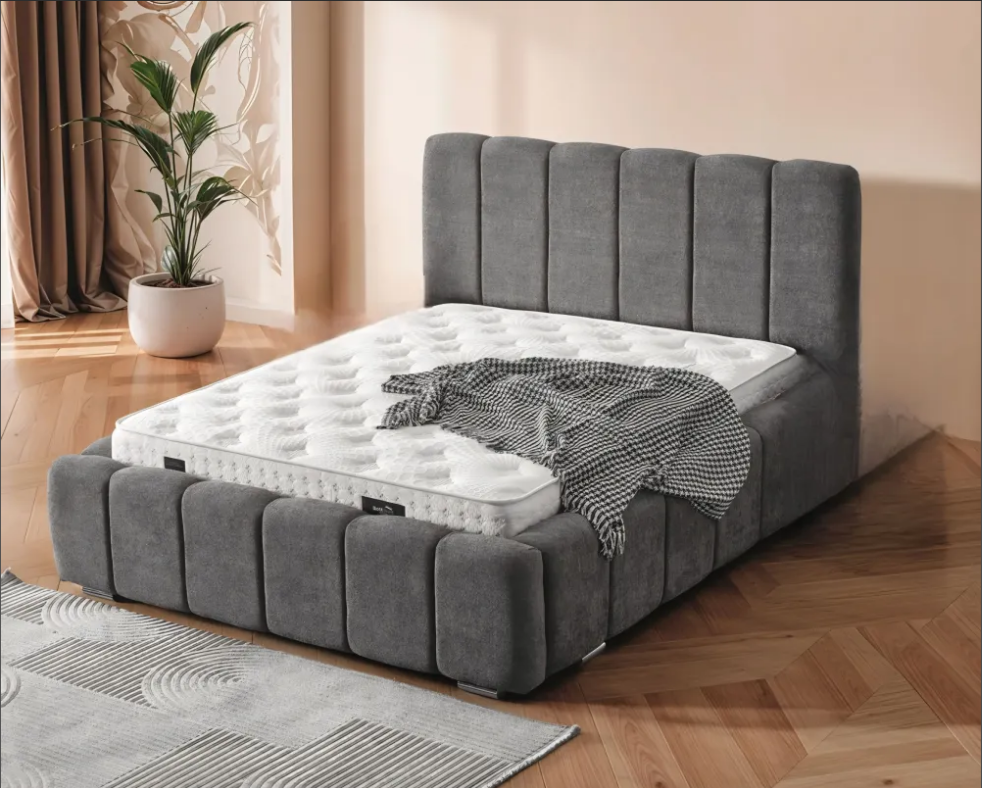 Hauteur Tête De Lit : 1m25 Longueur :2m25 Largeur : 1m87 Lit en Tissu Bouclette Gris Avec 2 Coffres Box