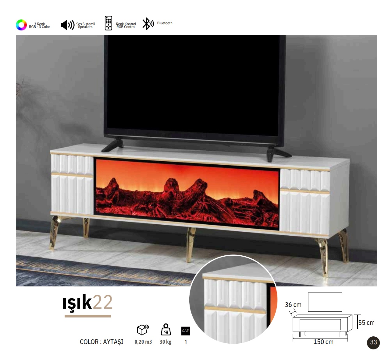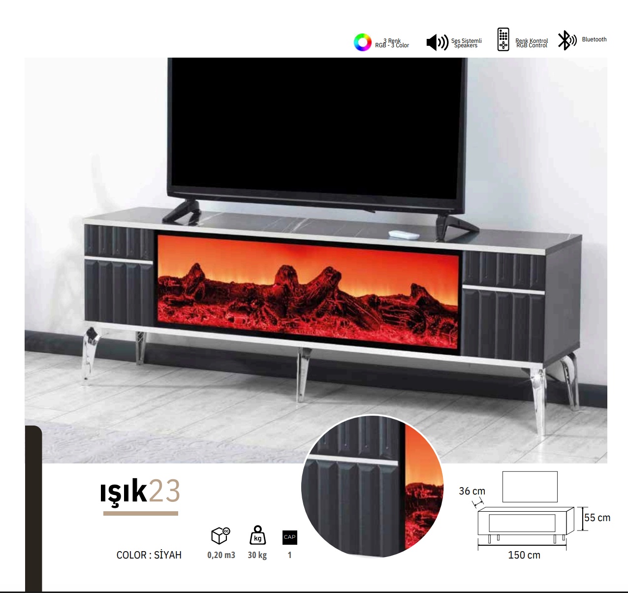 Meuble TV ISIK avec Cheminée – 150 cm